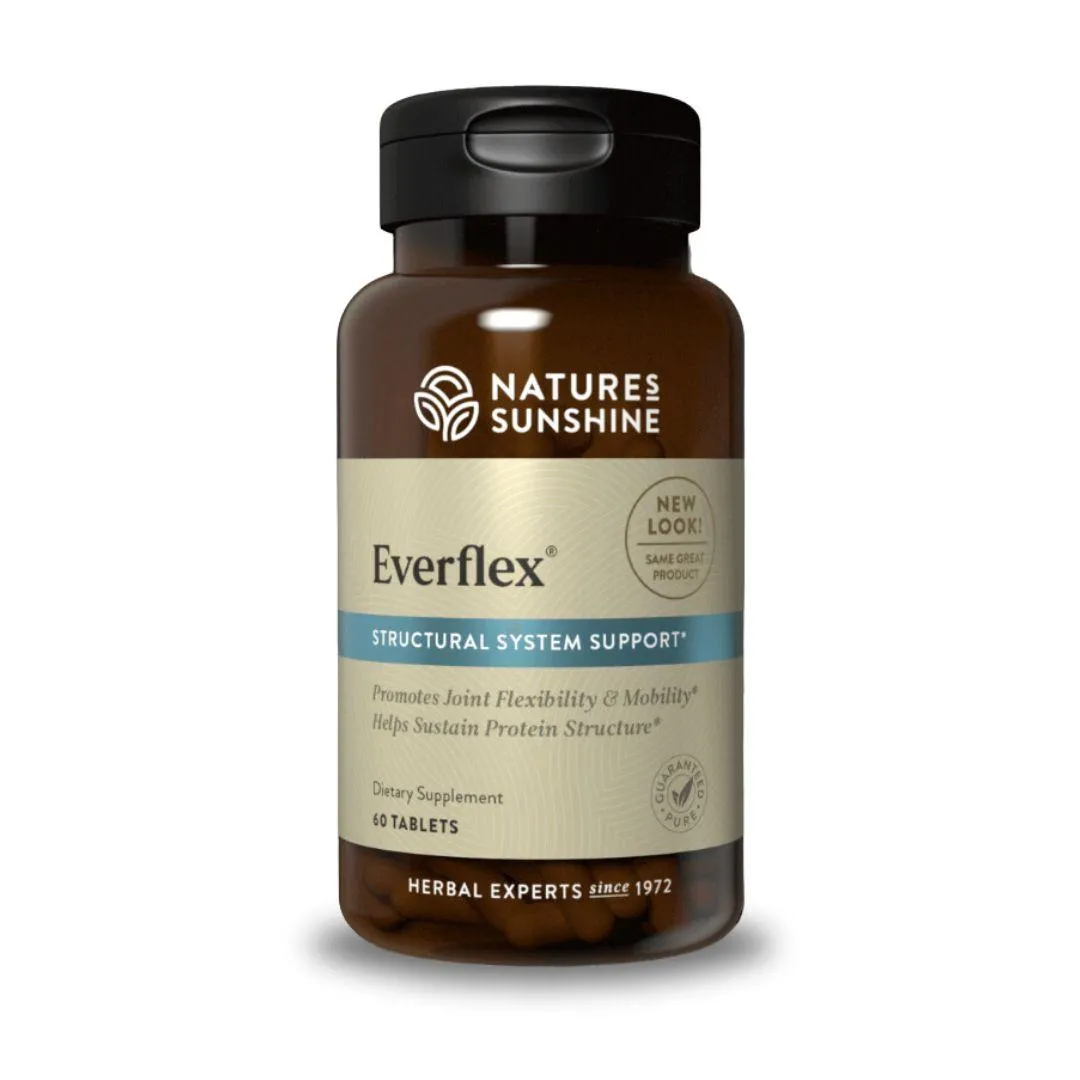 Nature’s Sunshine EverFlex supports joint health with glucosamine, chondroitin, MSM, and hyaluronic acid for lubrication, shock absorption, and flexibility.