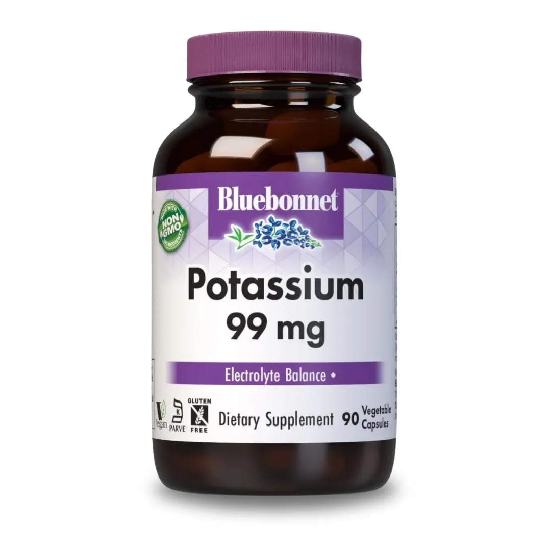 Bluebonnet's 99 mg Potassium Capsules, made with non-GMO ingredients, support electrolyte balance. Vegan, kosher, and gluten-free.
