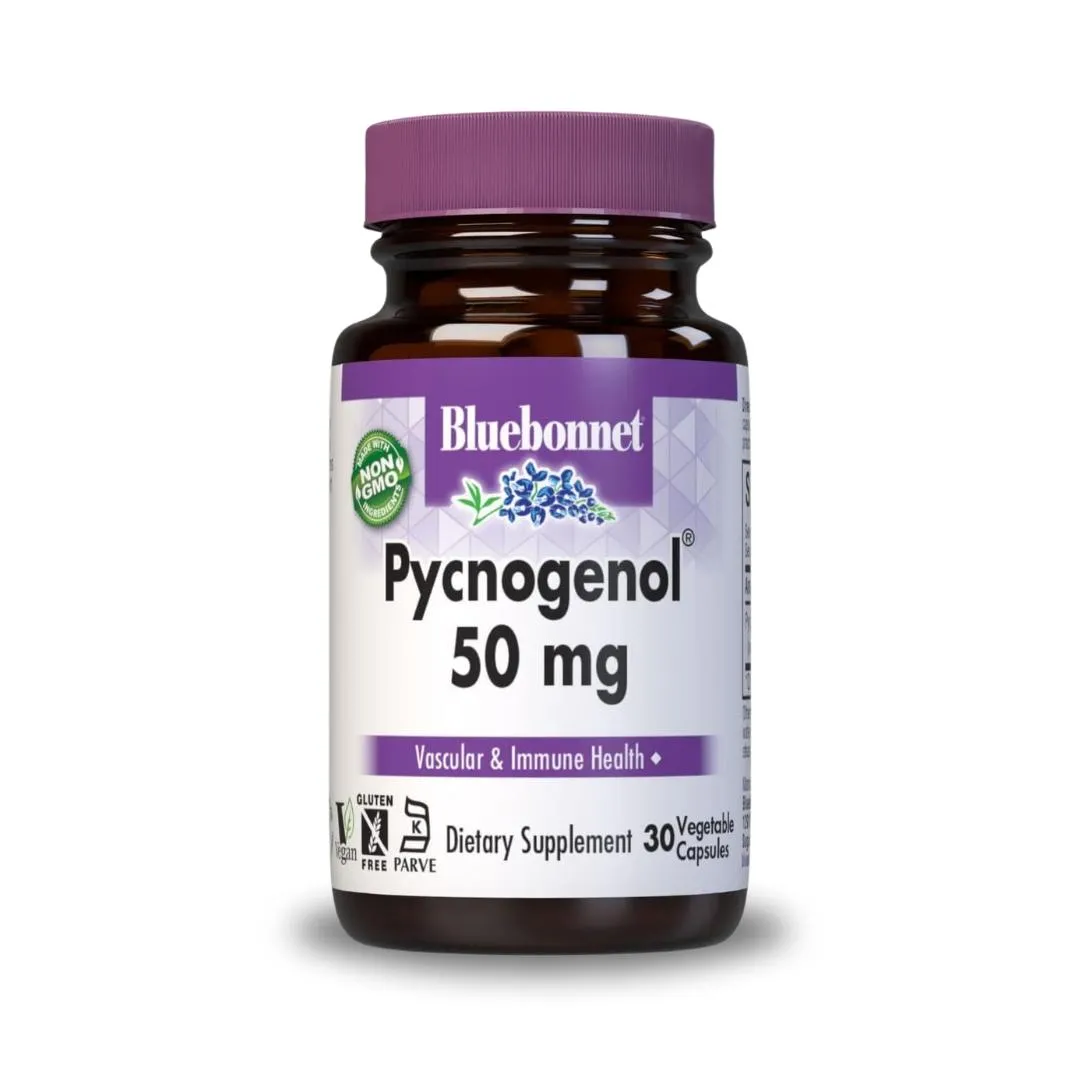 50mg pine bark extract for healthy blood circulation and immune support. Soy-free, gluten-free, non-GMO, Kosher, vegan. 30 servings.