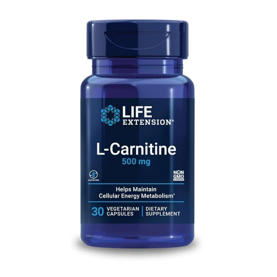 L-carnitine supports energy, memory, and heart health. Each 500 mg capsule is non-GMO, gluten-free, and promotes mitochondrial function.
