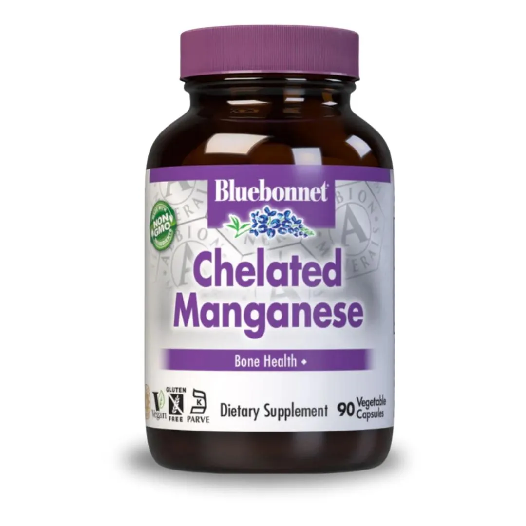 Bluebonnet’s Chelated Manganese Capsules provide 10 mg of manganese from manganese bisglycinate to support bone health.