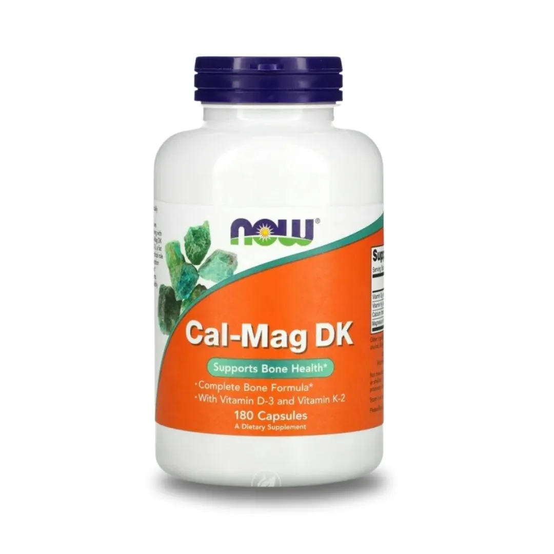 NOW Supplements Cal-Mag DK provides essential minerals for bone health, calcium, magnesium, and vitamins D-3 and K-2 to support bone metabolism and healthy calcification. Take 2 capsules twice daily with food.