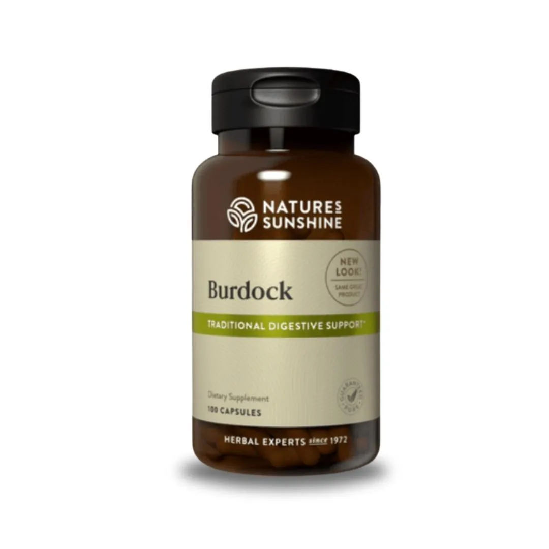 Burdock root supports urinary health, promotes digestion, and improves skin health. It has diuretic, diaphoretic, and mild antibiotic properties. Nature’s Sunshine ensures purity and quality control.